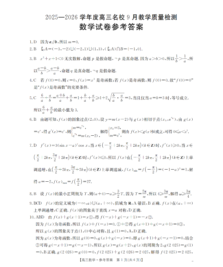 内蒙古2026届高三名校9月教学质量检测试卷 数学答案.pdf