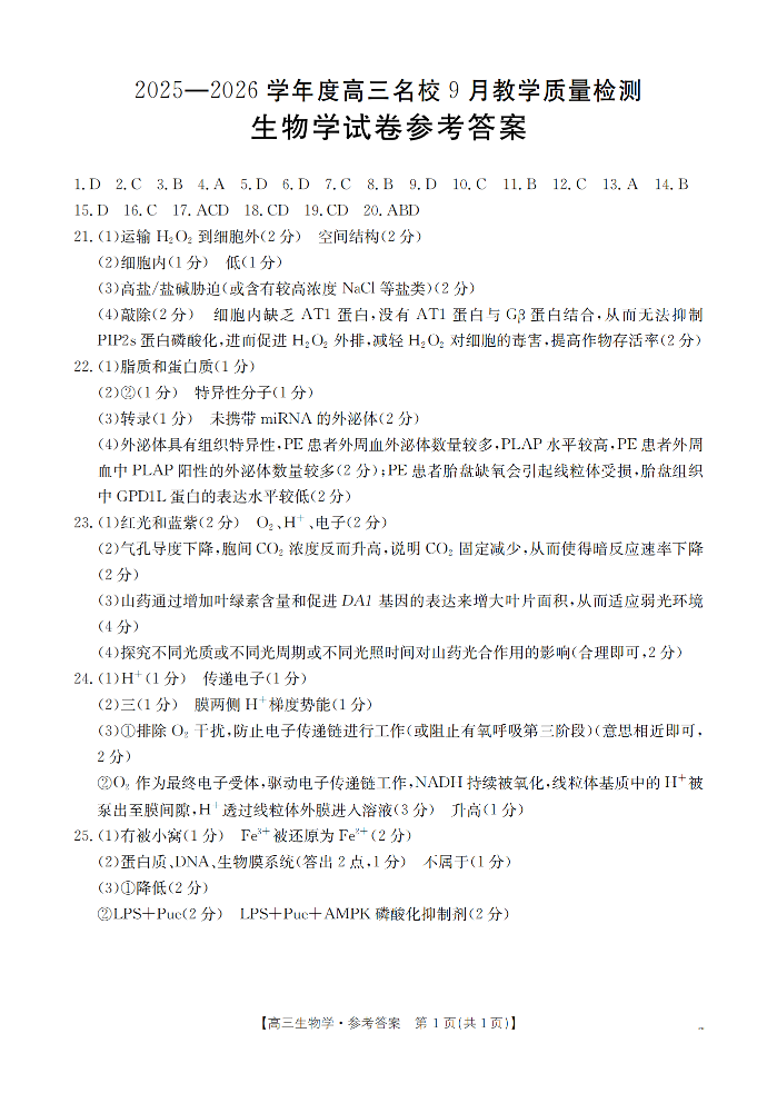 内蒙古2026届高三名校9月教学质量检测试卷 生物答案.pdf