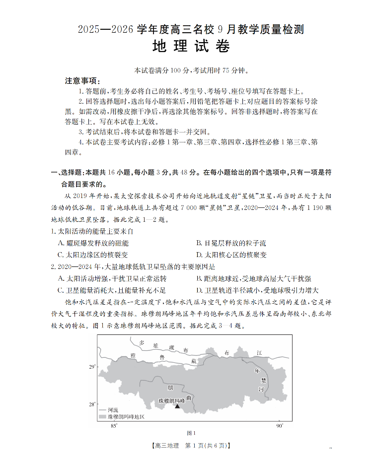 内蒙古2026届高三名校9月教学质量检测试卷 地理.pdf