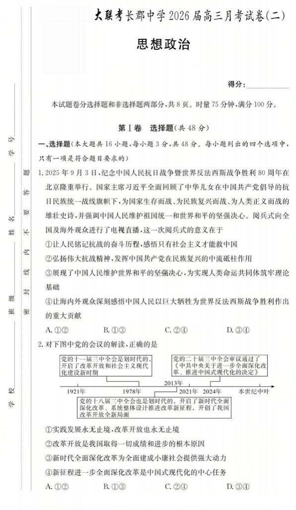 长郡中学2026届高三月考试卷(二)政治.pdf