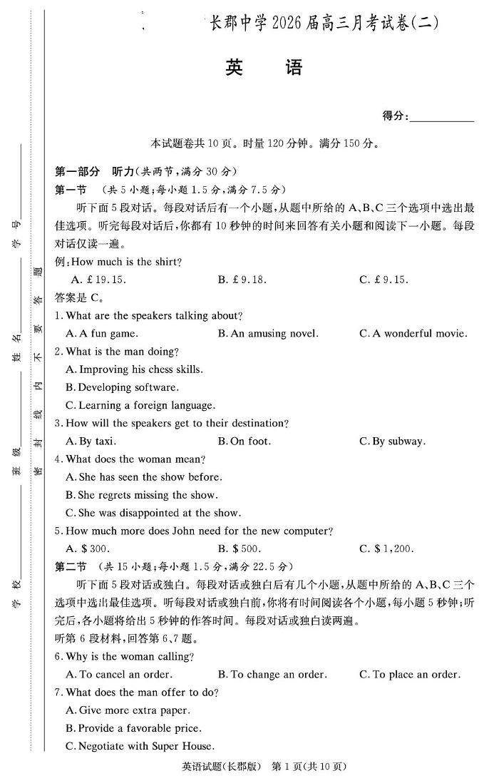 长郡中学2026届高三月考试卷(二)英语.pdf