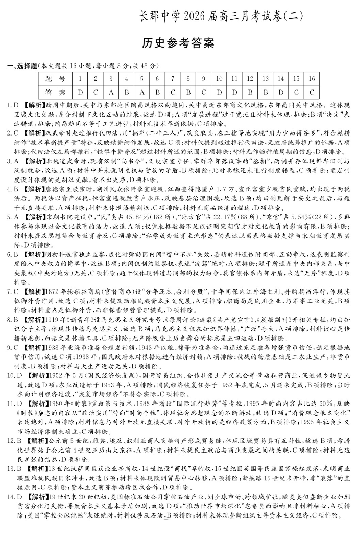 长郡中学2026届高三月考试卷(二)历史答案.pdf