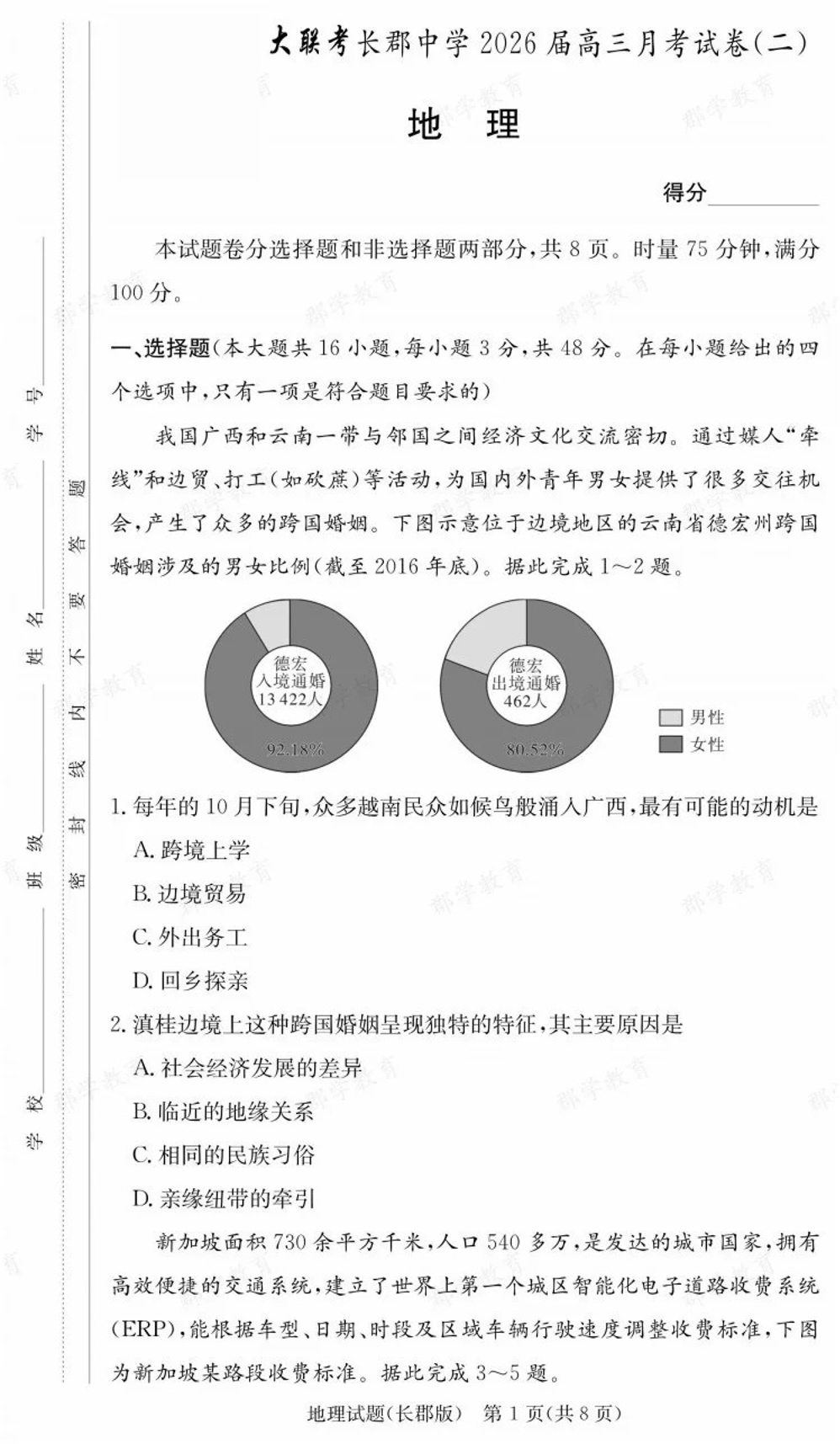 长郡中学2026届高三月考试卷(二)地理.pdf