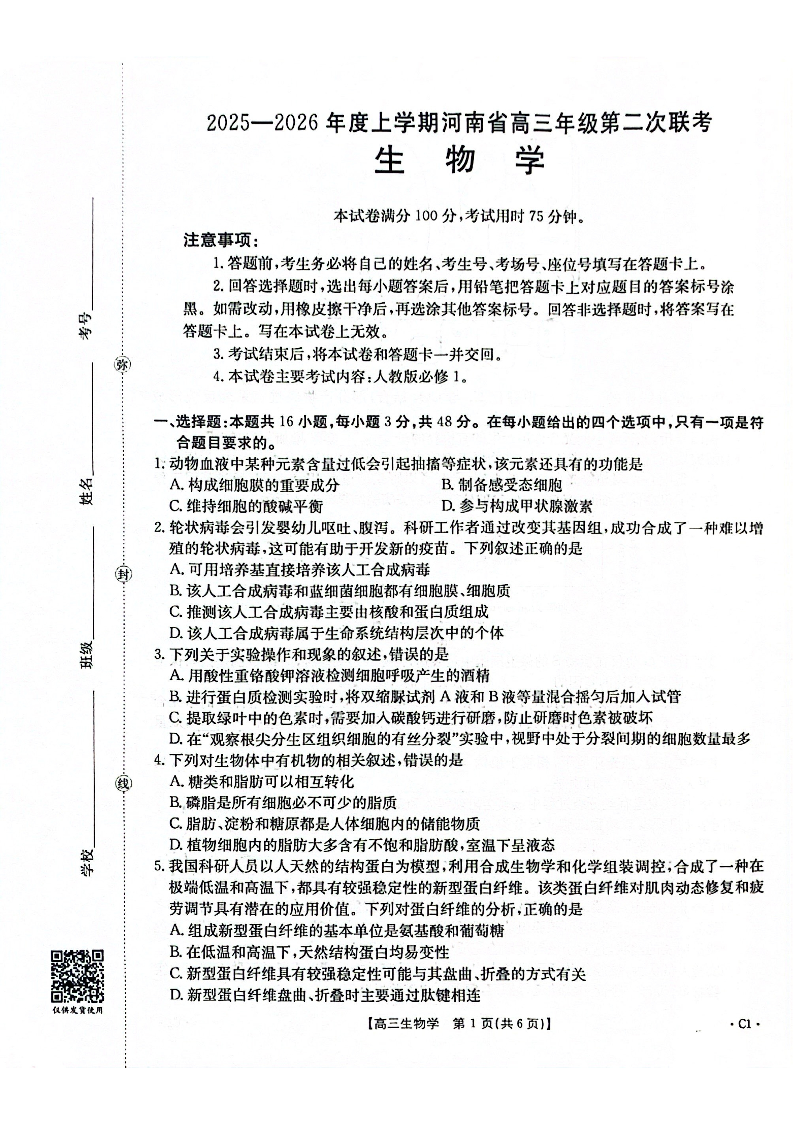 2025-2026年度上学期河南省高三年级第二次联考 生物.pdf