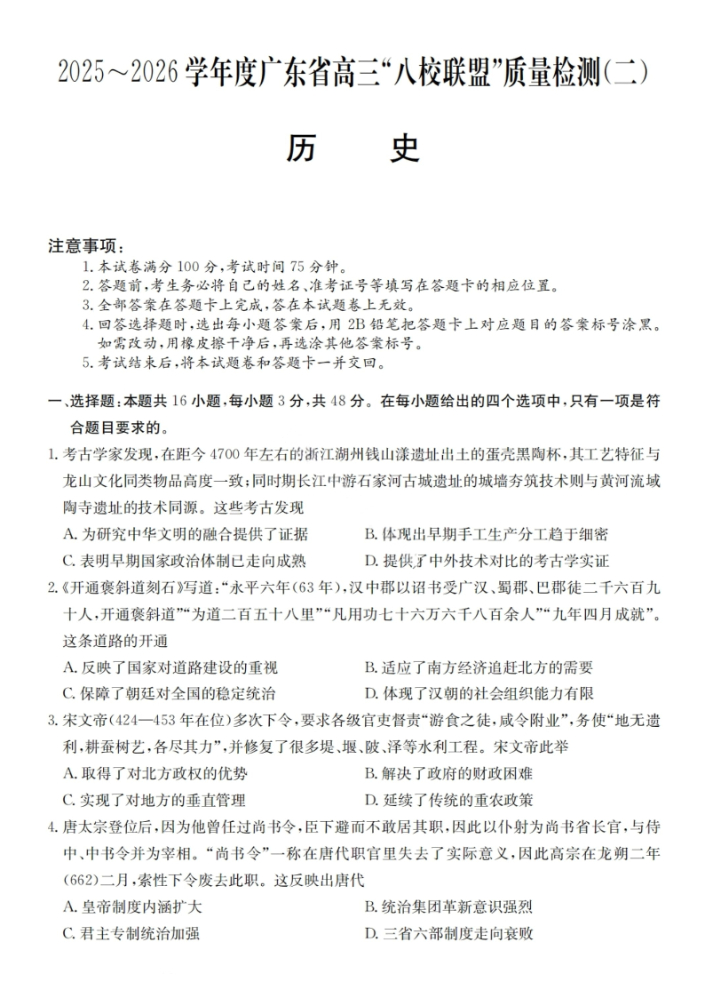 广东省2025-2026学年度高三“八校联盟”质量检测(二)历史试题(含答案).pdf