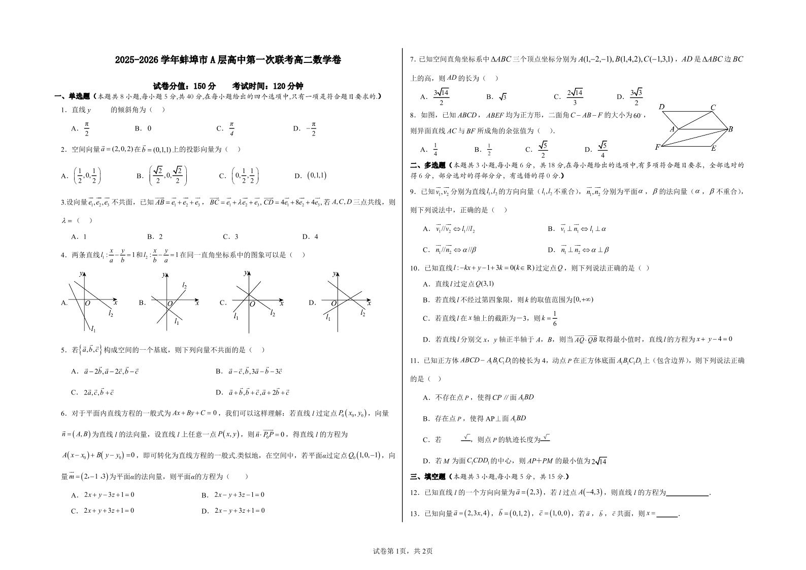 安徽省蚌埠市A层高中2025-2026学年高二上学期10月月考 数学试题(含答案).pdf