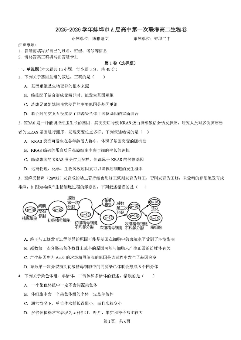 安徽省蚌埠市A层高中2025-2026学年高二上学期10月月考 生物试题(含答案).pdf