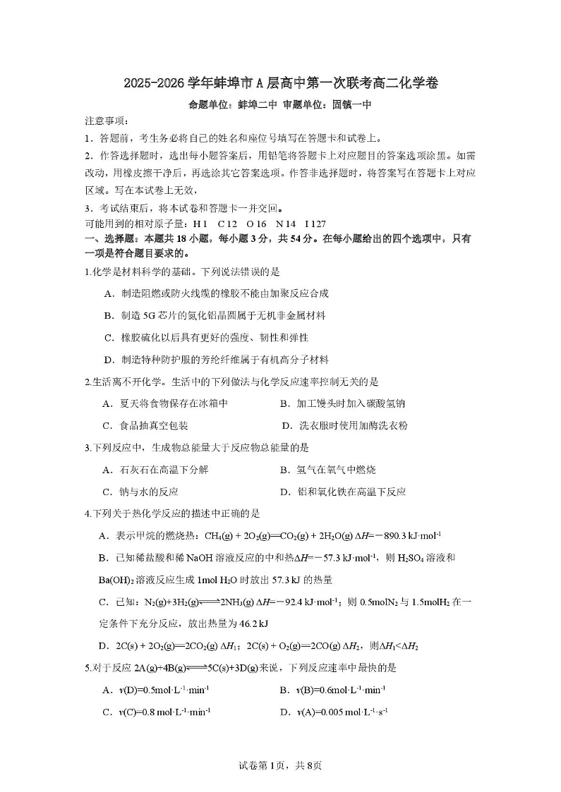 安徽省蚌埠市A层高中2025-2026学年高二上学期10月月考 化学试题(含答案).pdf