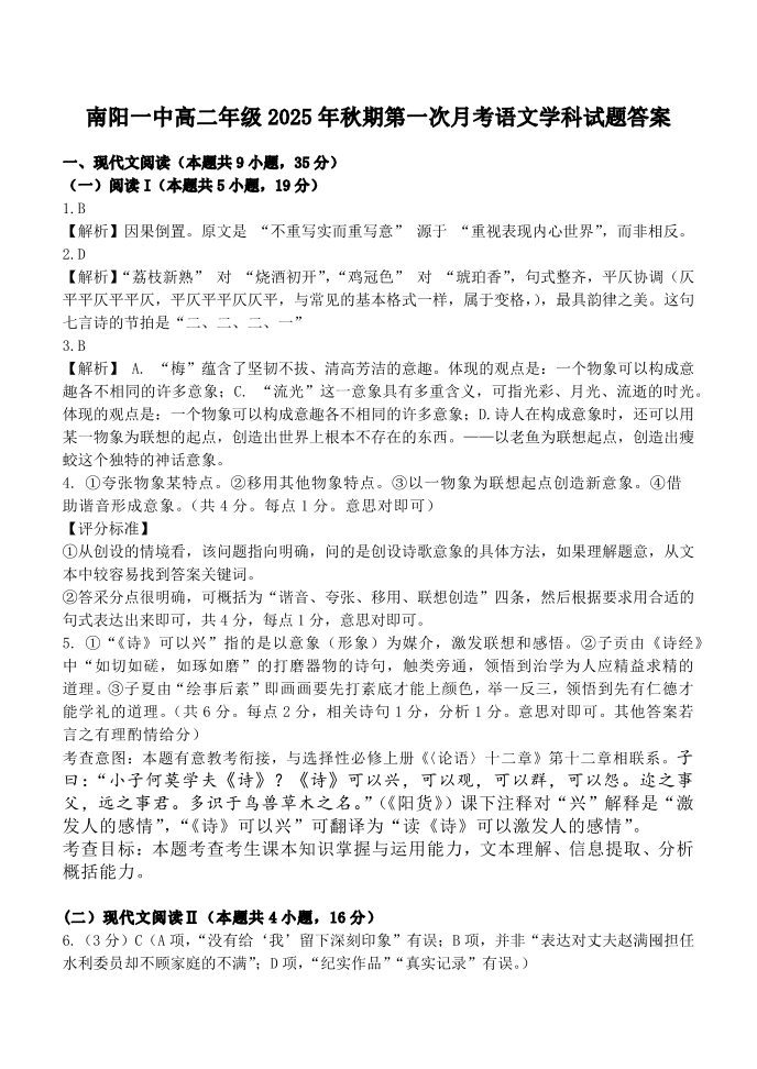 南阳一中高二年级2025年秋期第一次月考 语文答案.pdf
