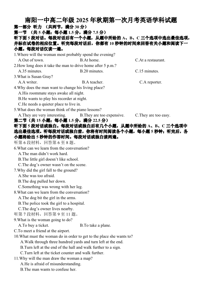 南阳一中高二年级2025年秋期第一次月考 英语试题(含答案).pdf