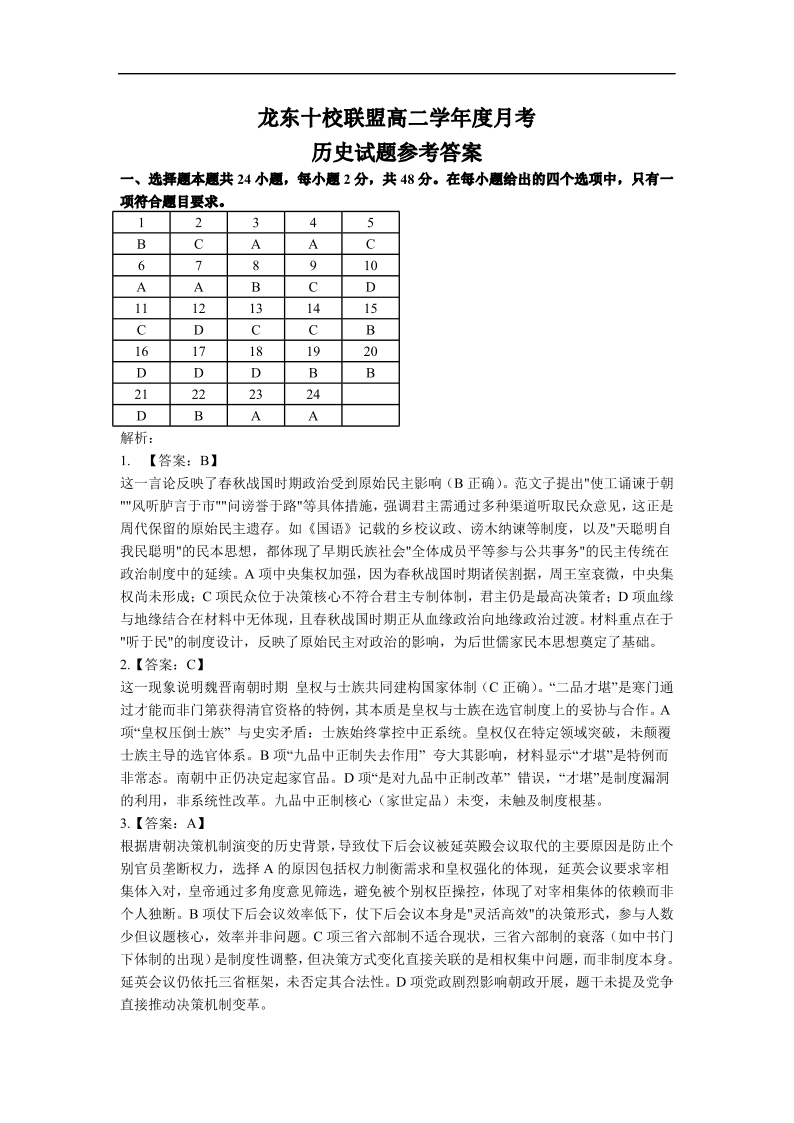黑龙江省龙东十校联盟2025-2026学年高二上学期10月月考 历史答案.pdf