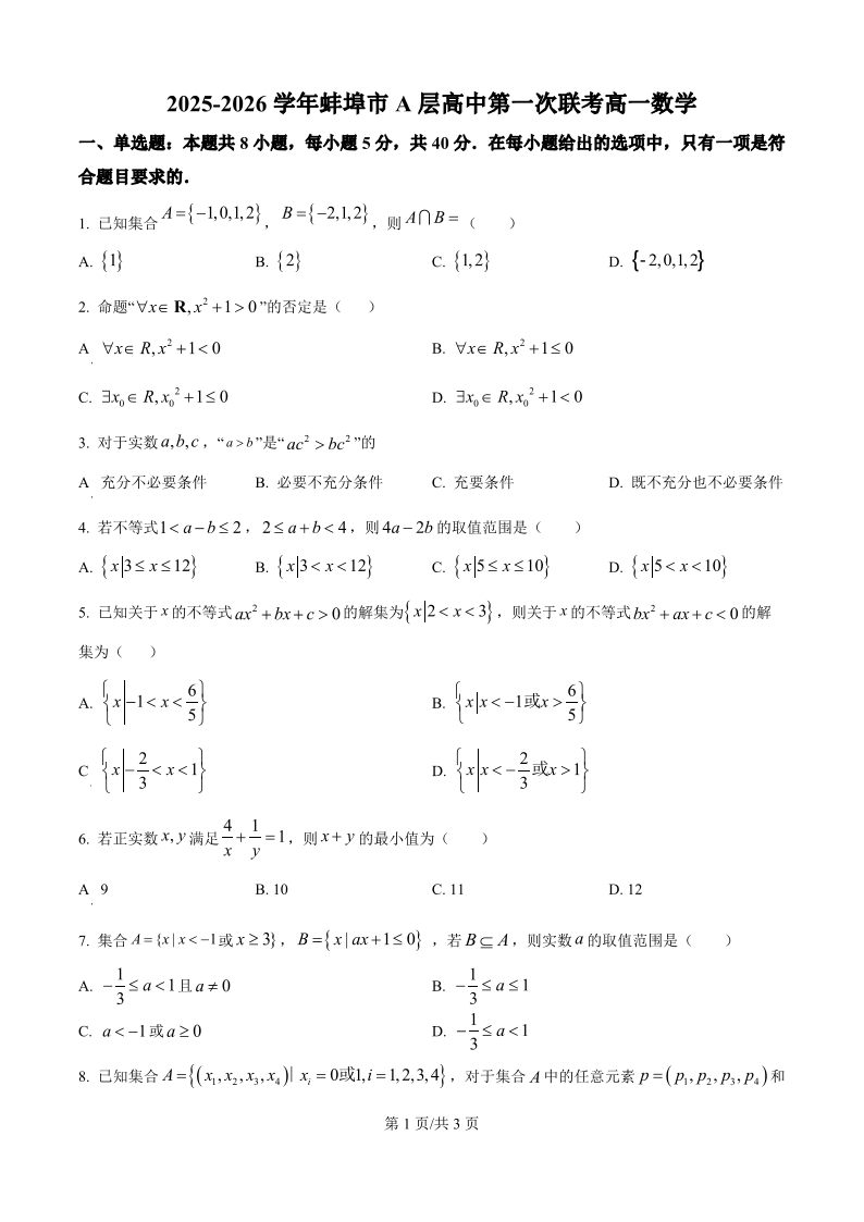 安徽省蚌埠市A层高中2025-2026学年高一上学期10月月考 数学.pdf