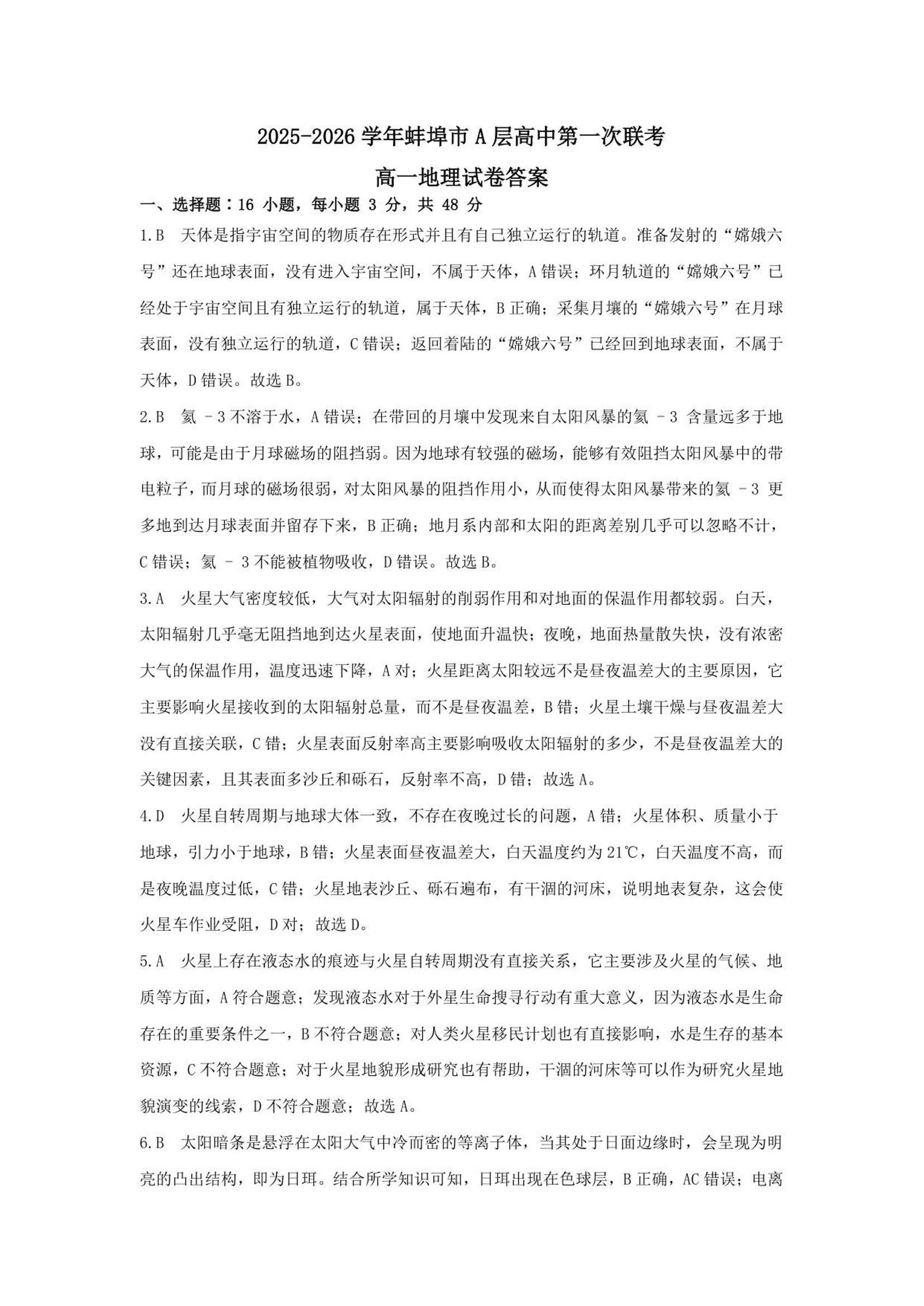 安徽省蚌埠市A层高中2025-2026学年高一上学期10月月考 地理答案.pdf