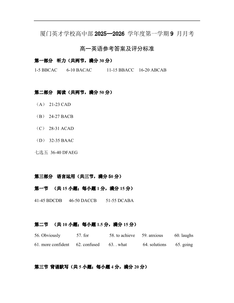 厦门英才学校高中部2025-2026学年度高一年级第一学期9月份考试 英语答案.pdf
