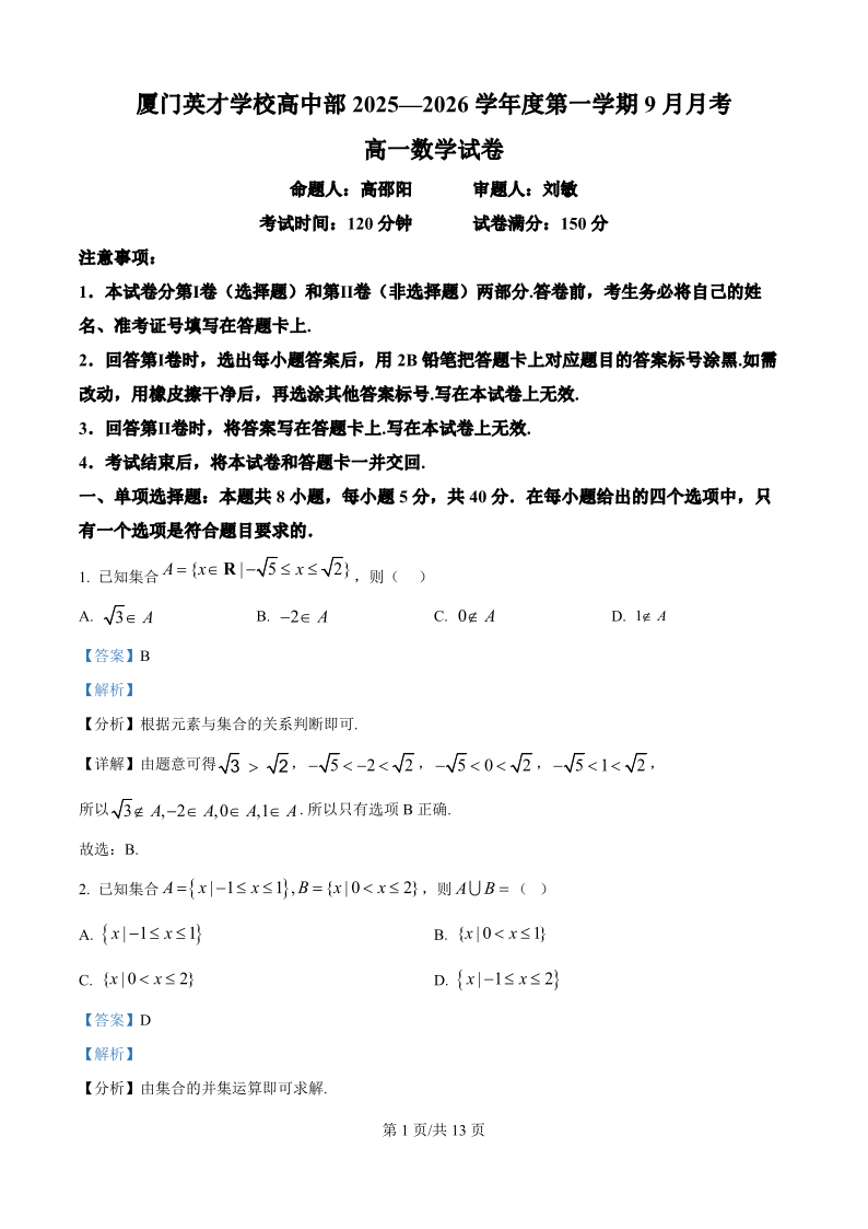 厦门英才学校高中部2025-2026学年度高一年级第一学期9月份考试 数学答案.pdf