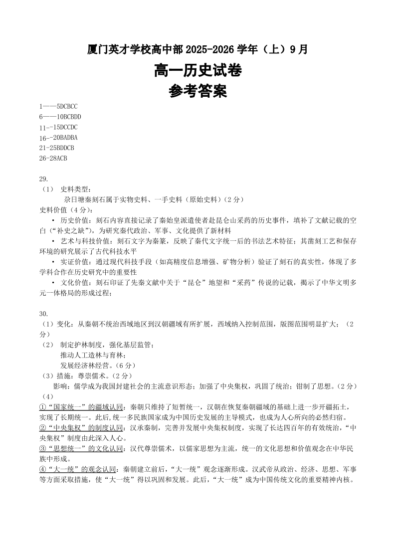 厦门英才学校高中部2025-2026学年度高一年级第一学期9月份考试 历史答案.pdf