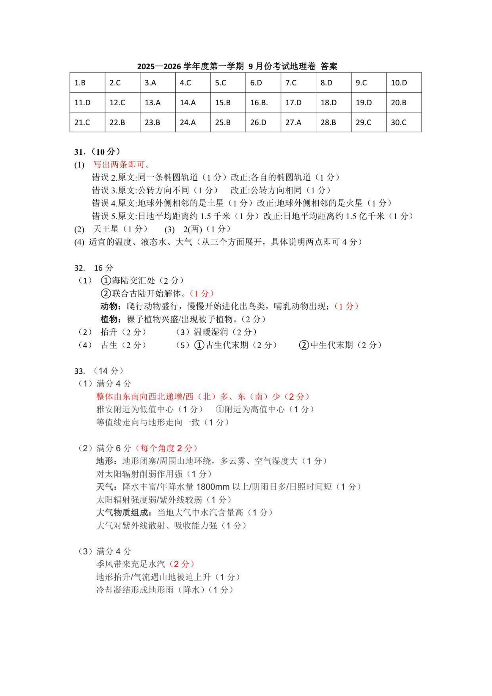 厦门英才学校高中部2025-2026学年度高一年级第一学期9月份考试 地理答案.pdf
