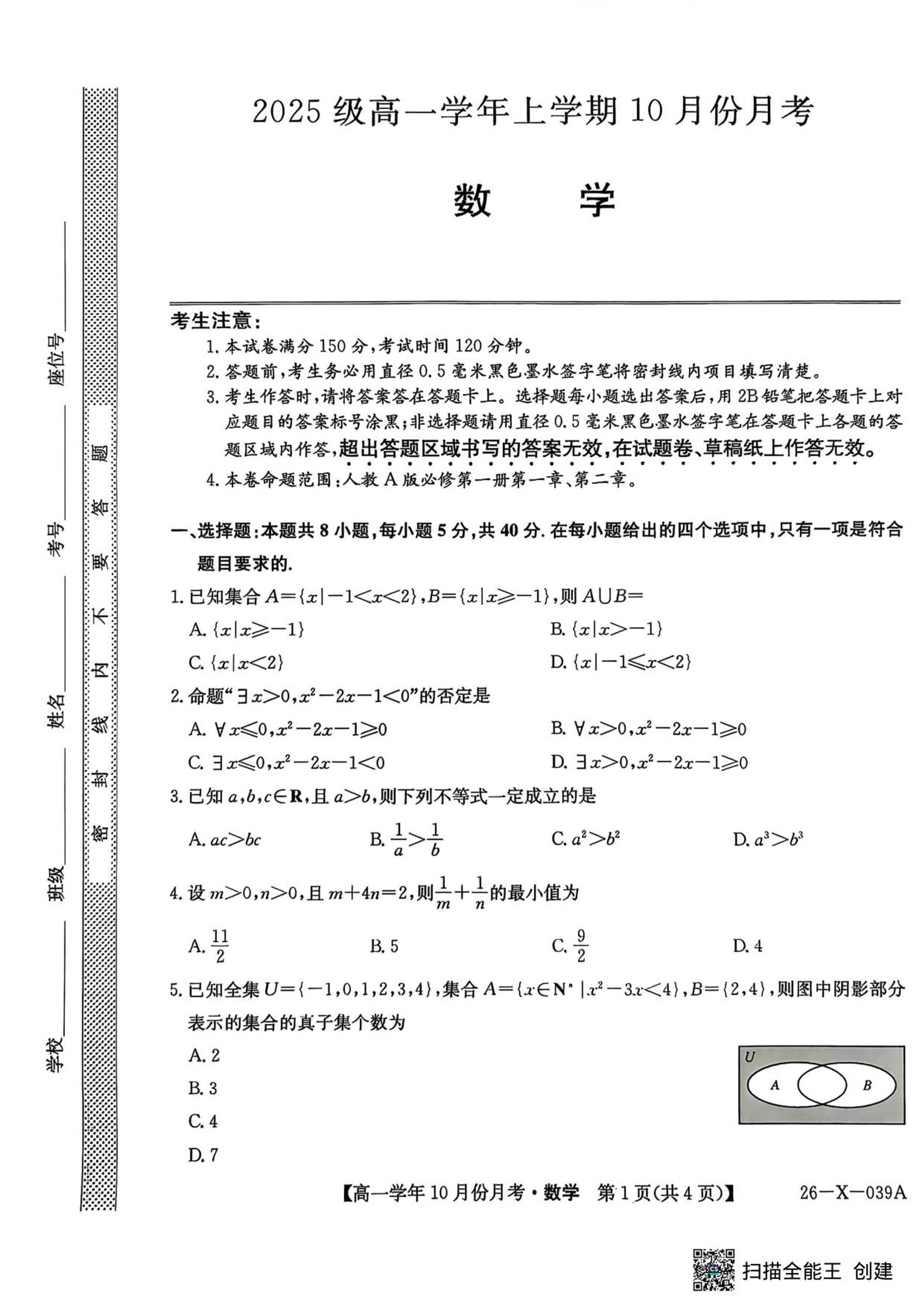 黑龙江省龙东十校联盟2025-2026学年高一上学期10月月考 数学.pdf