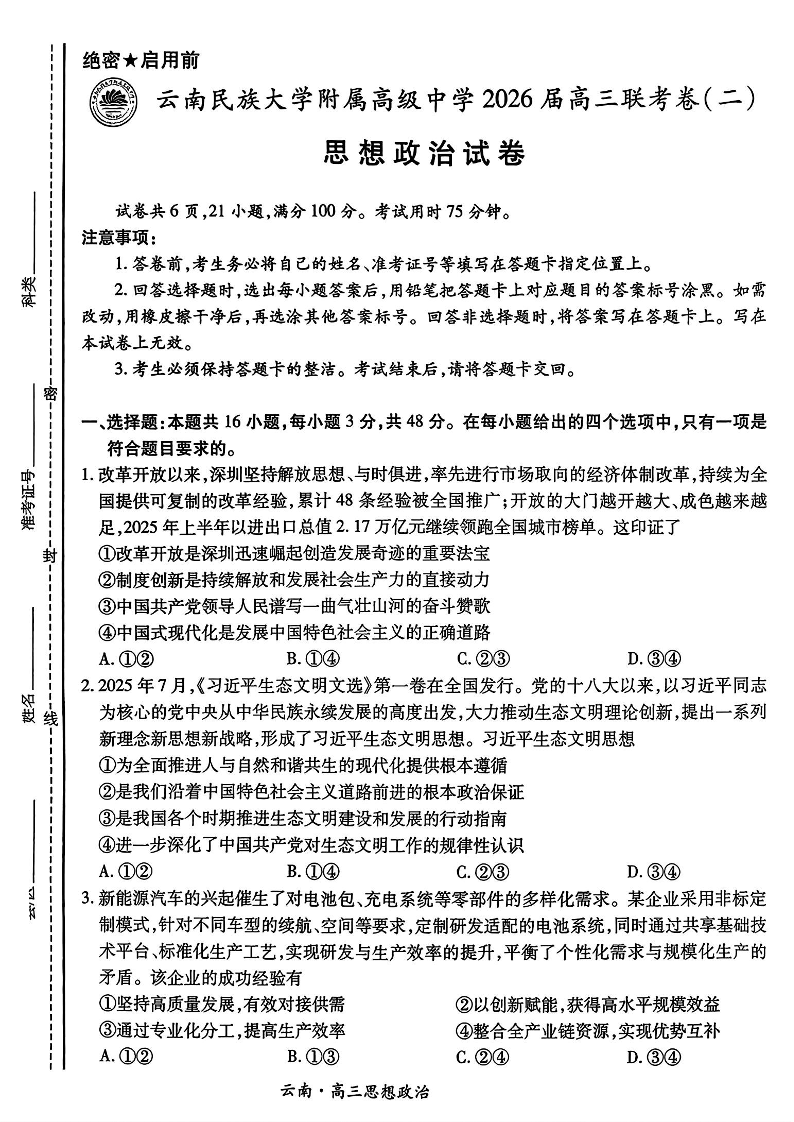 云南民族大学附属高级中学2026届高三联考卷(二)政治.pdf