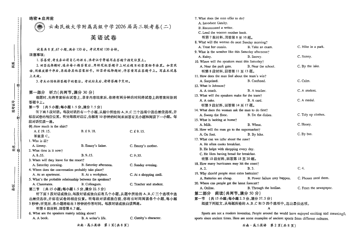 云南民族大学附属高级中学2026届高三联考卷(二)英语.pdf