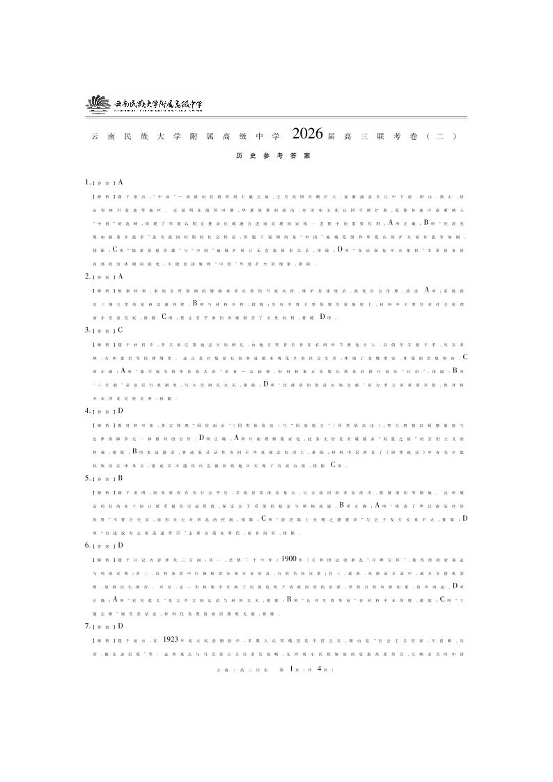 云南民族大学附属高级中学2026届高三联考卷(二)历史答案.pdf