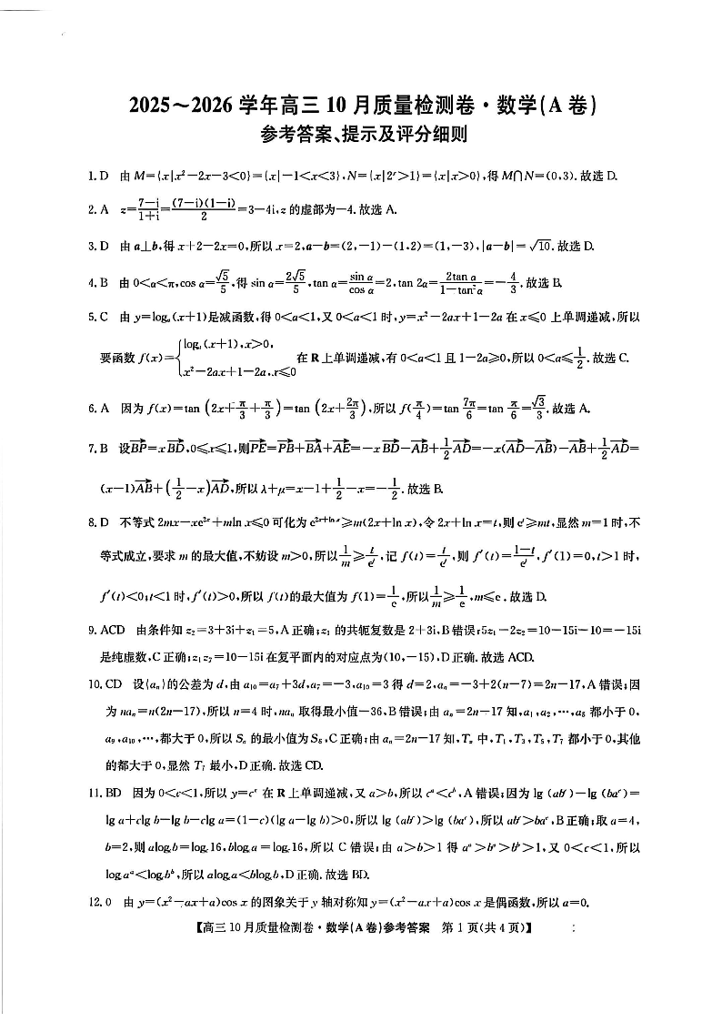 山西三晋卓越联盟2025-2026高三10月质量检测 数学(A)答案.pdf