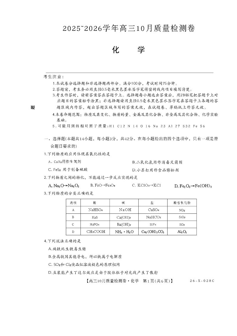 山西三晋卓越联盟2025-2026高三10月质量检测 化学.pdf