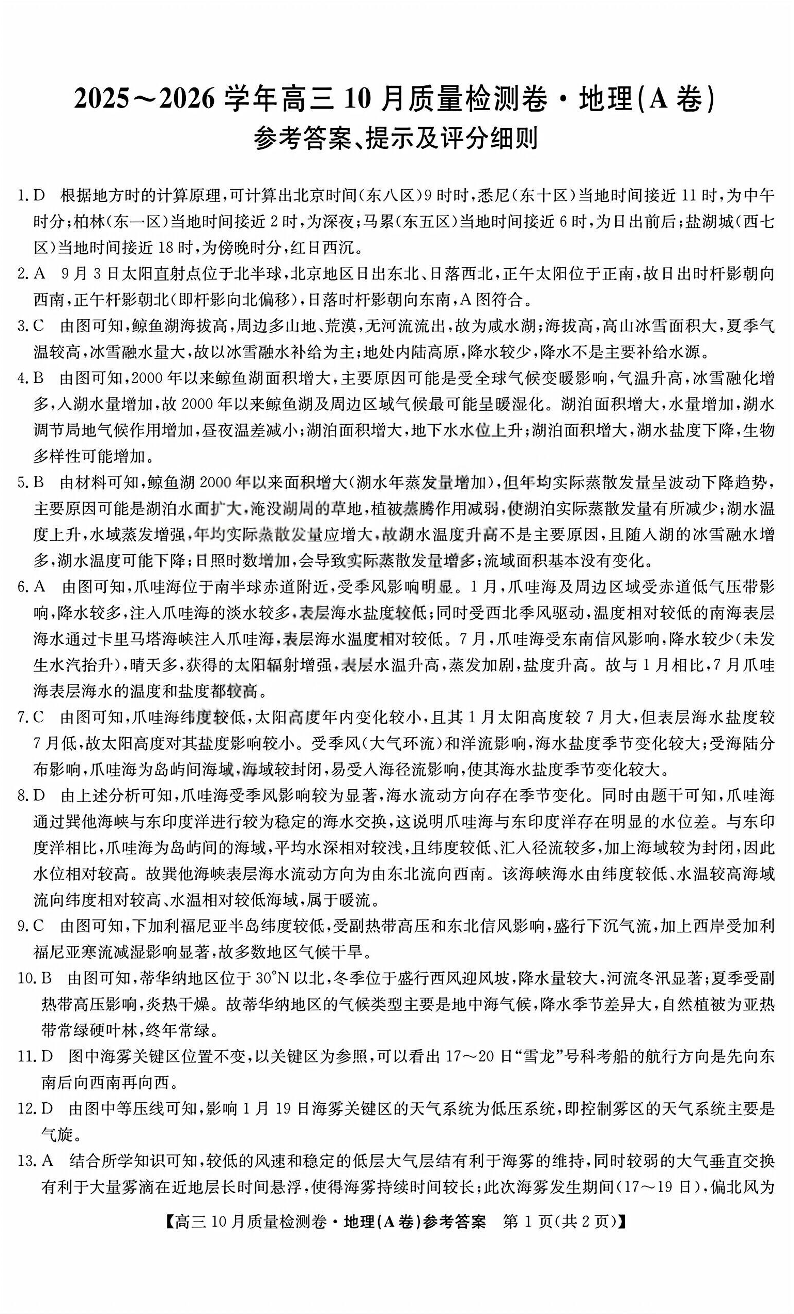 山西三晋卓越联盟2025-2026高三10月质量检测 地理(A)答案.pdf