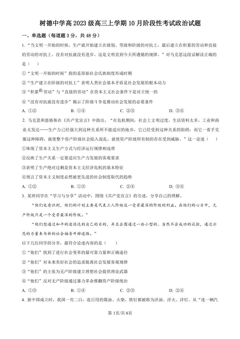 树德中学2025-2026学年高三上学期10月月考 政治.docx