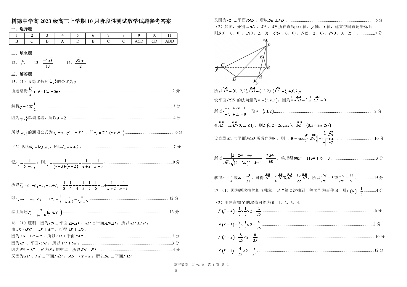 树德中学2025-2026学年高三上学期10月月考 数学答案.docx
