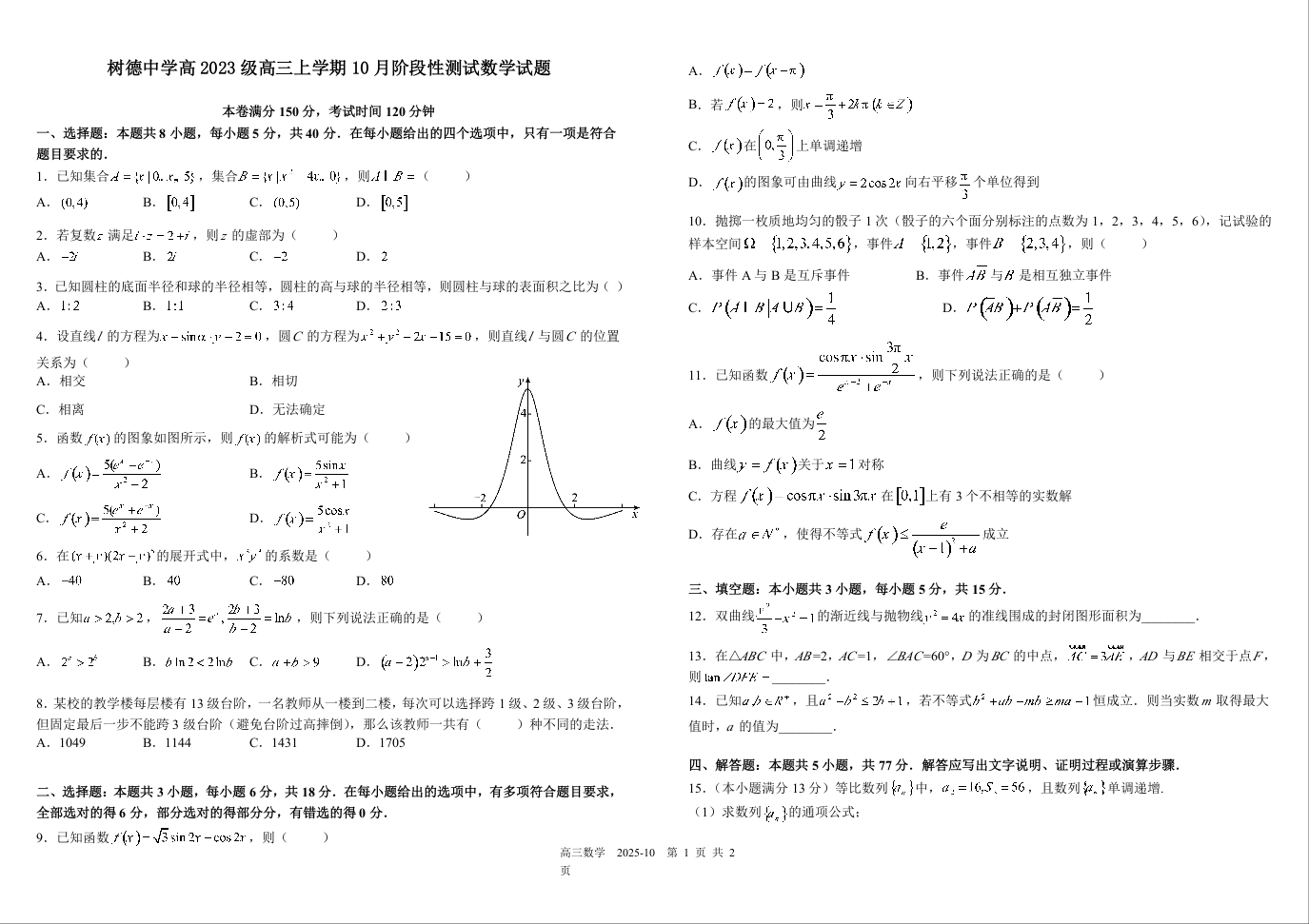 树德中学2025-2026学年高三上学期10月月考 数学.docx