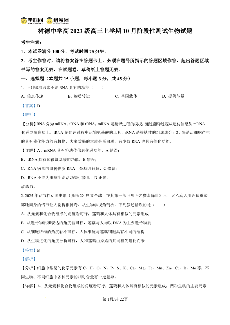 树德中学2025-2026学年高三上学期10月月考 生物答案.docx