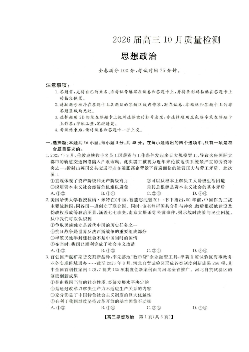 金科大联考·河北省2026届高三10月质量检测 政治.pdf