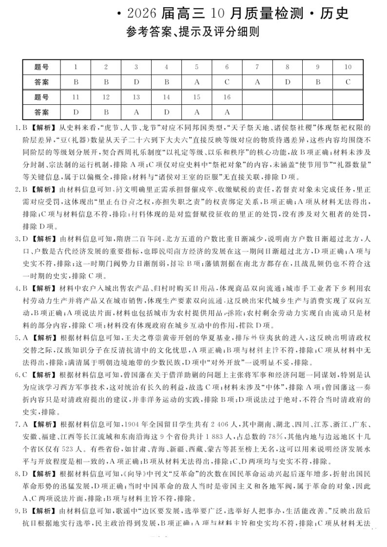 金科大联考·河北省2026届高三10月质量检测 历史答案.pdf