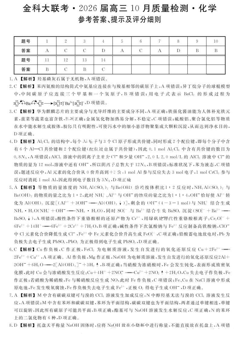 金科大联考·河北省2026届高三10月质量检测 化学答案.pdf