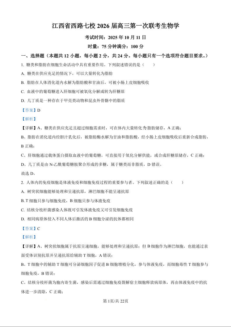 江西省西路七校2026届高三第一次联考 生物答案.docx