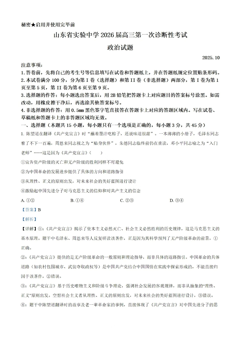 山东省实验中学2026届高三第一次诊断考试 政治答案.pdf