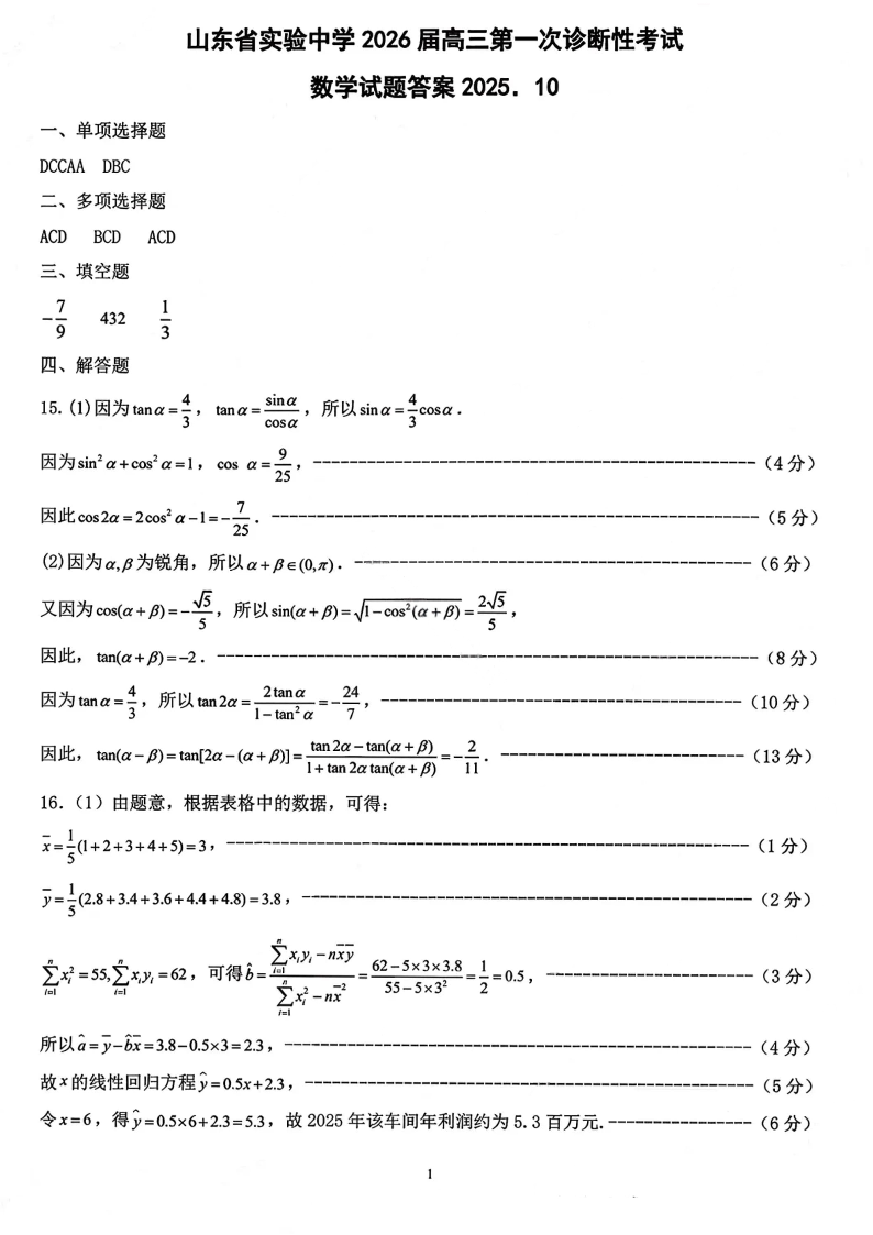 山东省实验中学2026届高三第一次诊断考试 数学答案.pdf