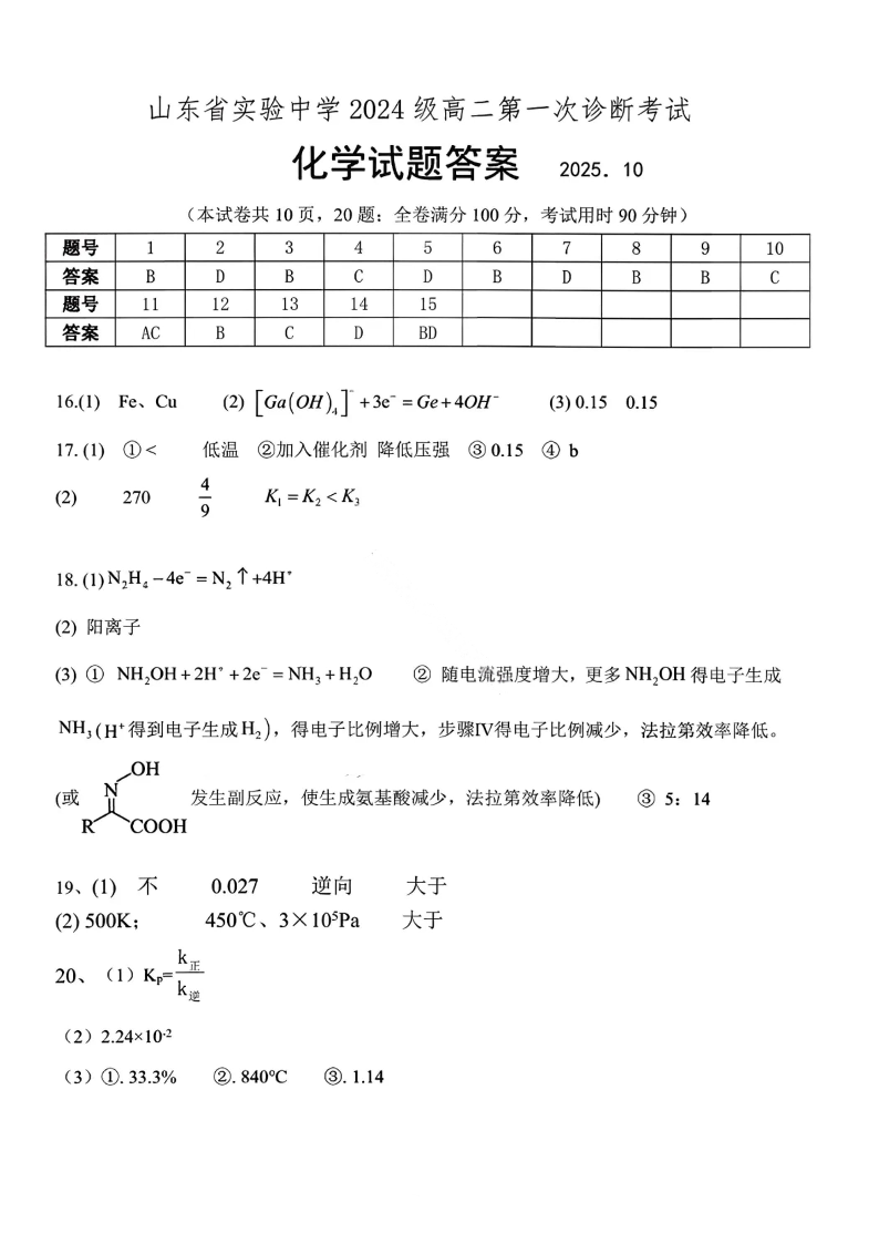 山东省实验中学2026届高三第一次诊断考试 化学答案.pdf