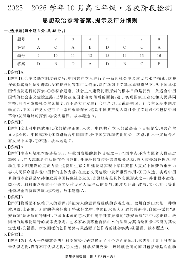 安徽省2025—2026学年度“耀正优”高三年级10月阶段检测 政治答案.pdf