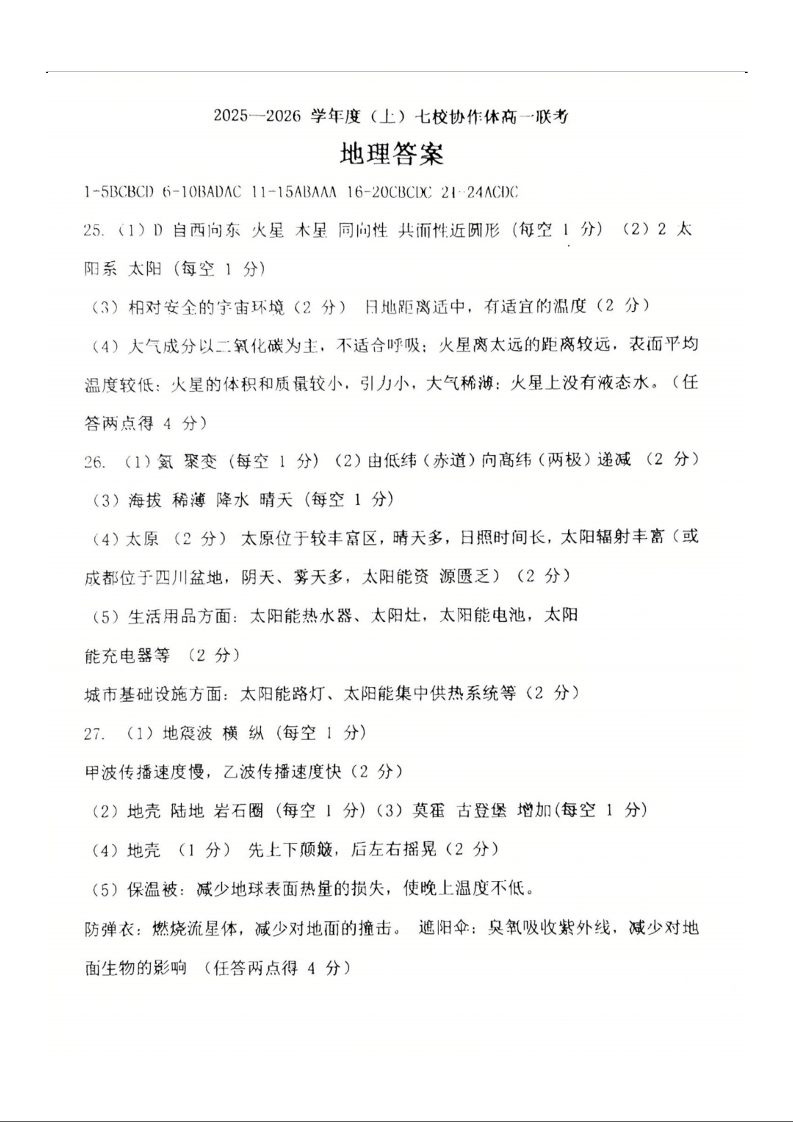 2025-2026 学年度(上)七校协作体高一联考 地理答案.docx