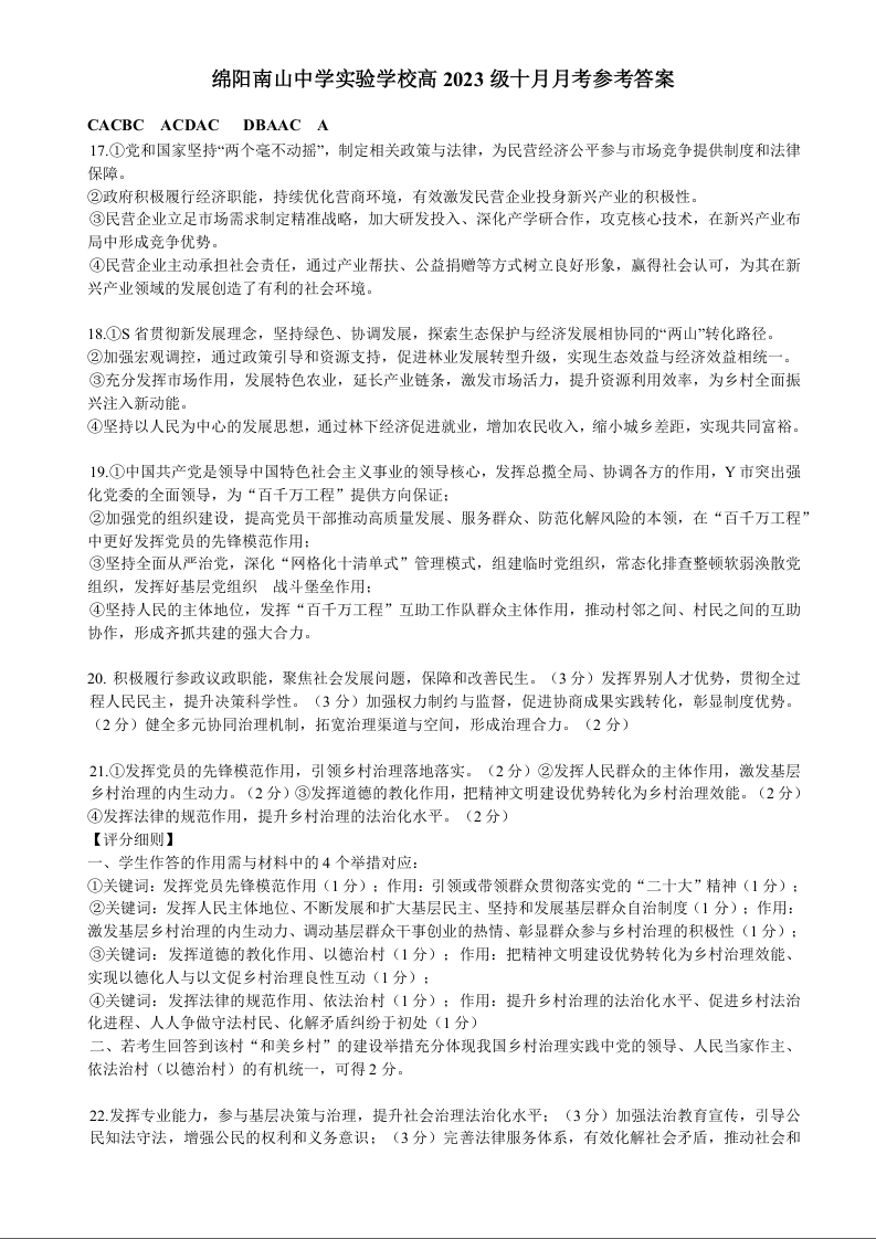 绵阳南山中学实验学校高2023级高三(上)10月月考 政治答案.docx
