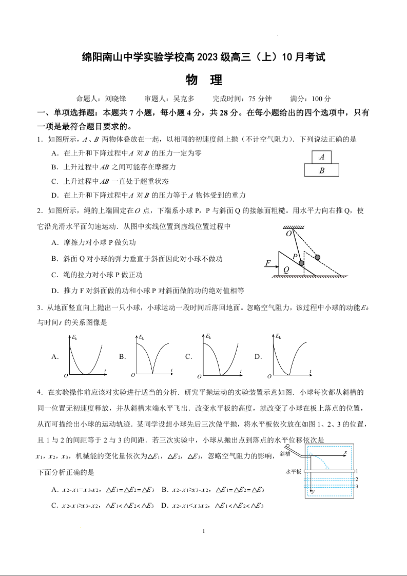 绵阳南山中学实验学校高2023级高三(上)10月月考 物理.docx