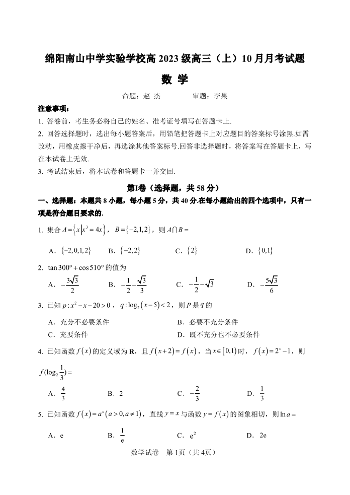 绵阳南山中学实验学校高2023级高三(上)10月月考 数学.pdf