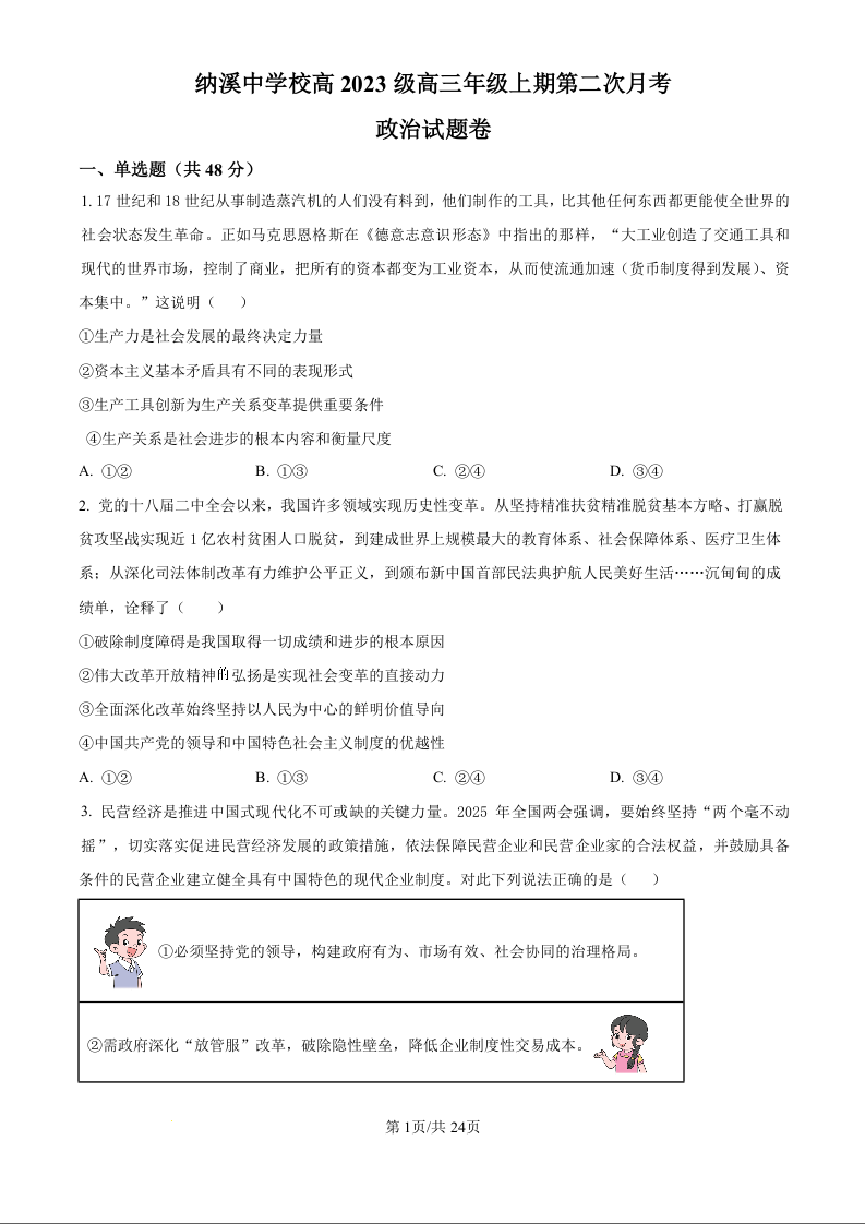 纳溪中学校高 2023 级高三年级上期第二次月考 政治试题(含答案).docx
