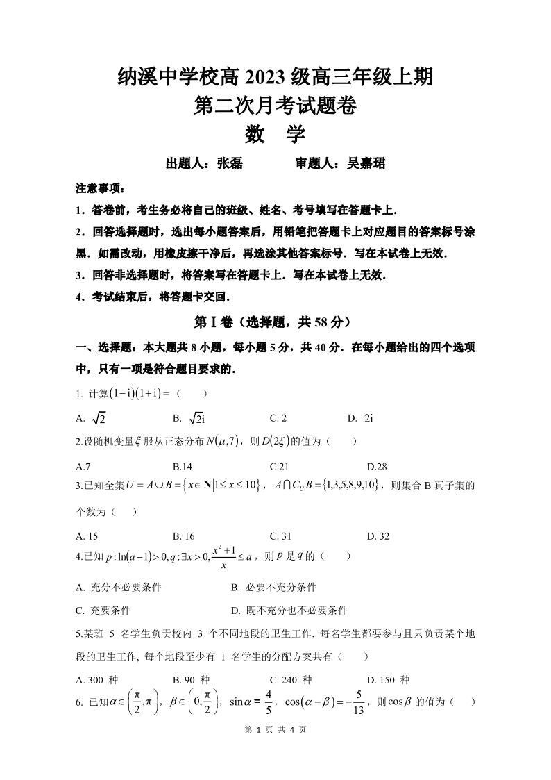 纳溪中学校高 2023 级高三年级上期第二次月考 数学试题(含答案).pdf