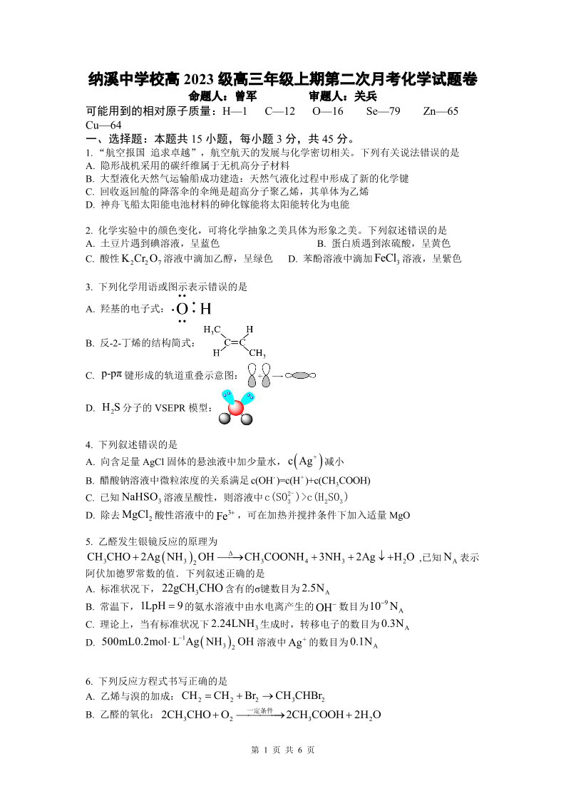 纳溪中学校高 2023 级高三年级上期第二次月考 化学试题(含答案).pdf