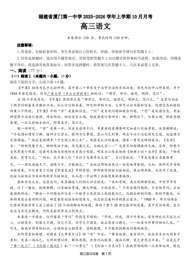 福建省厦门第一中学2025-2026学年高三上学期10月月考 语文试题(含答案).pdf