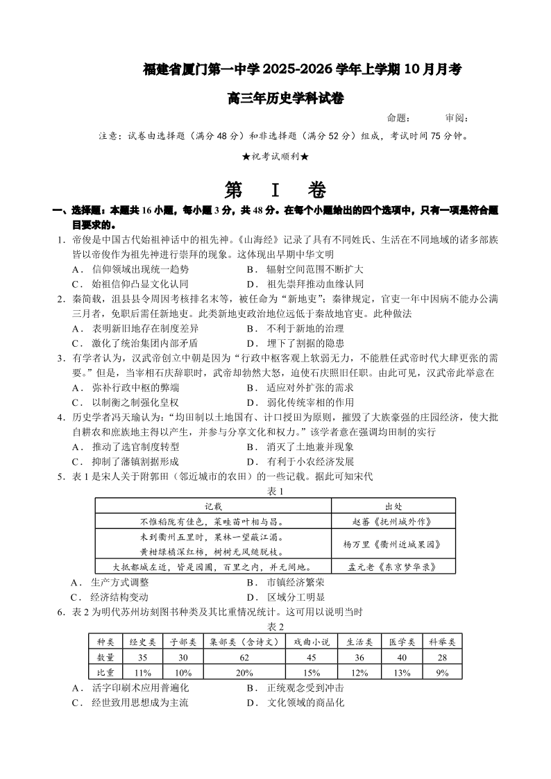 福建省厦门第一中学2025-2026学年高三上学期10月月考 历史试题(含答案).pdf