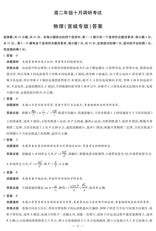 物理宣城专版 安徽高二年级十月调研考试答案.pdf